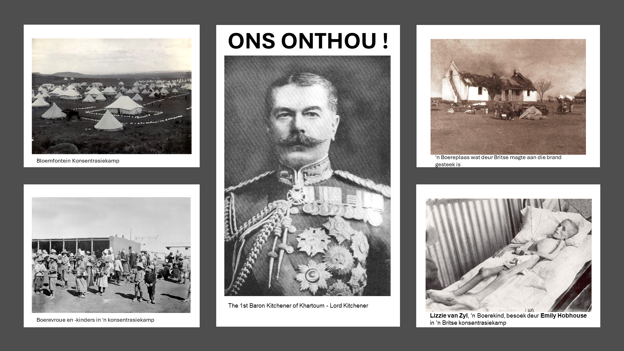 Op 16 Junie 1900 het Lord Roberts proklamasie nr. 5 uitgevaardig - ’n bevel wat plaashuise van Boere op die front moes verbrand, en wat vroue en kinders na konsentrasiekampe moes oordra. Twee weke later het vroue en kinders se gesigte begin dui op ’n tragedie in wording. Hierdie bevel het oor 125 jaar steeds 'n impak op die Afrikaner, maar ook ’n nalatenskap van geloof en dapperheid gevorm.